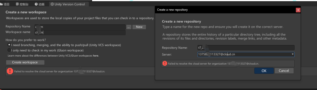 如果你遇到failed to resolve the cloud server for organization xx@cloud.cn 又或者是创建项目使用Unity version control无限卡Creatin…